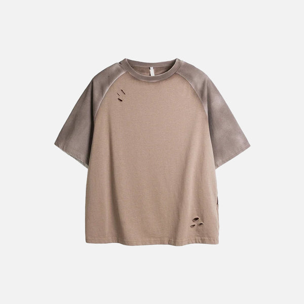 Front view of the coffee Vintage Patched Shoulders T-shirt from DAXUEN
