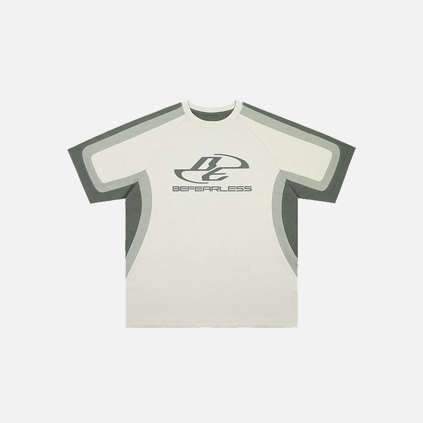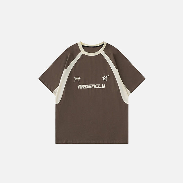 Front view of the brown Loose Racing Patchwork T-shirt in a gray background