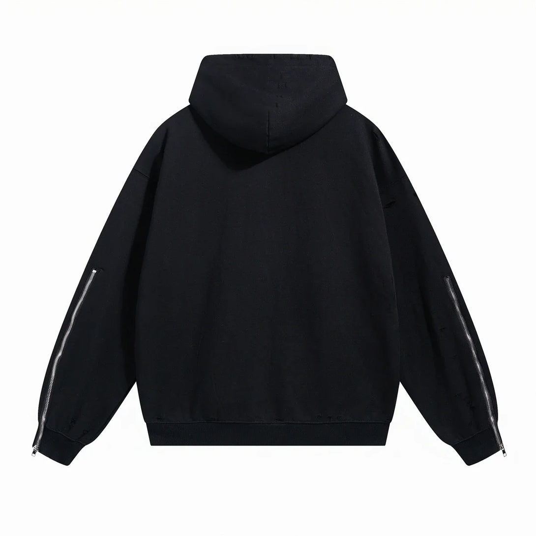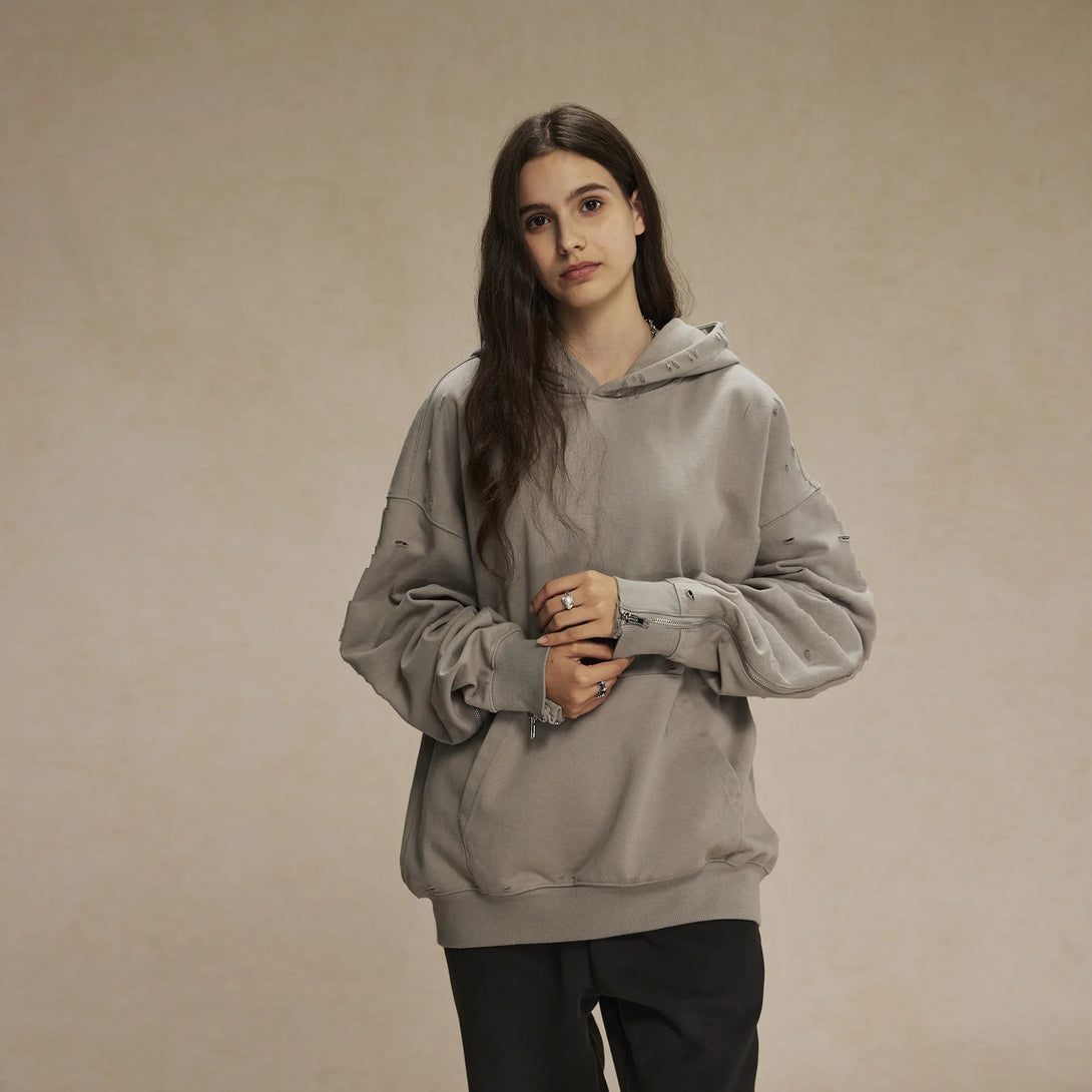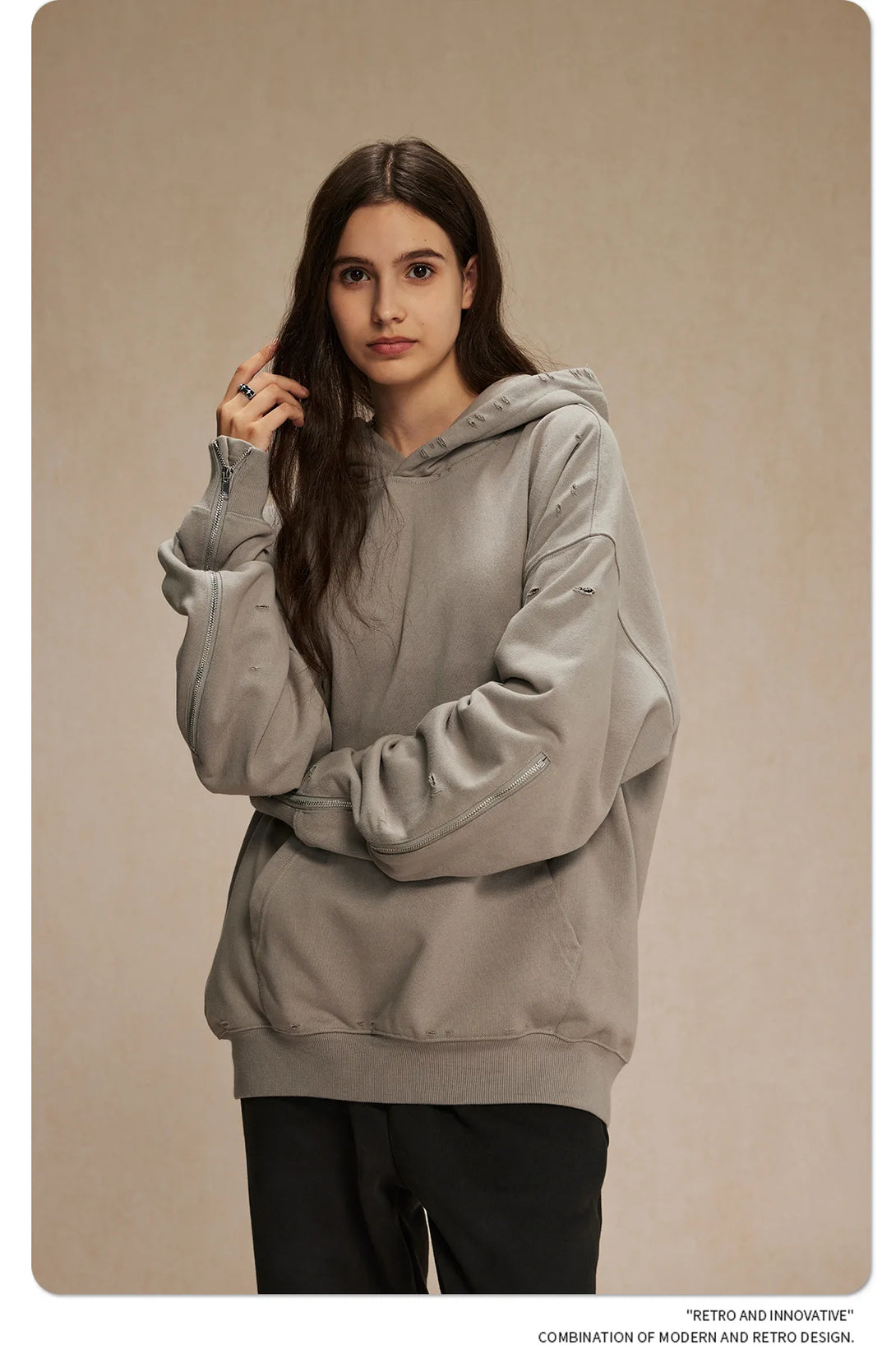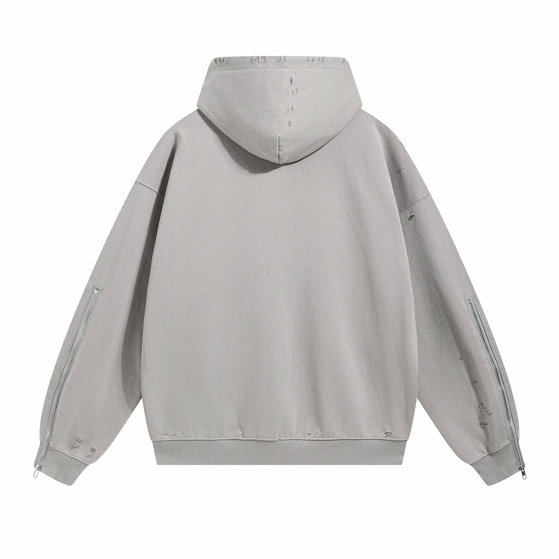 Ausgefranstes Woll-Kapuzenpullover mit Reißverschluss