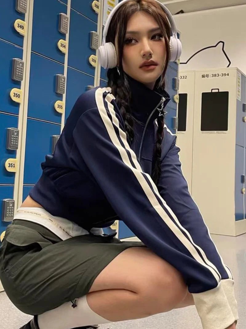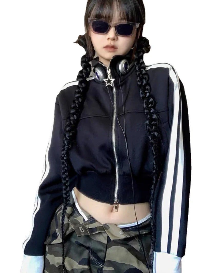 Vintage Korean Style Striped Zip-Up Crop Sweatshirt