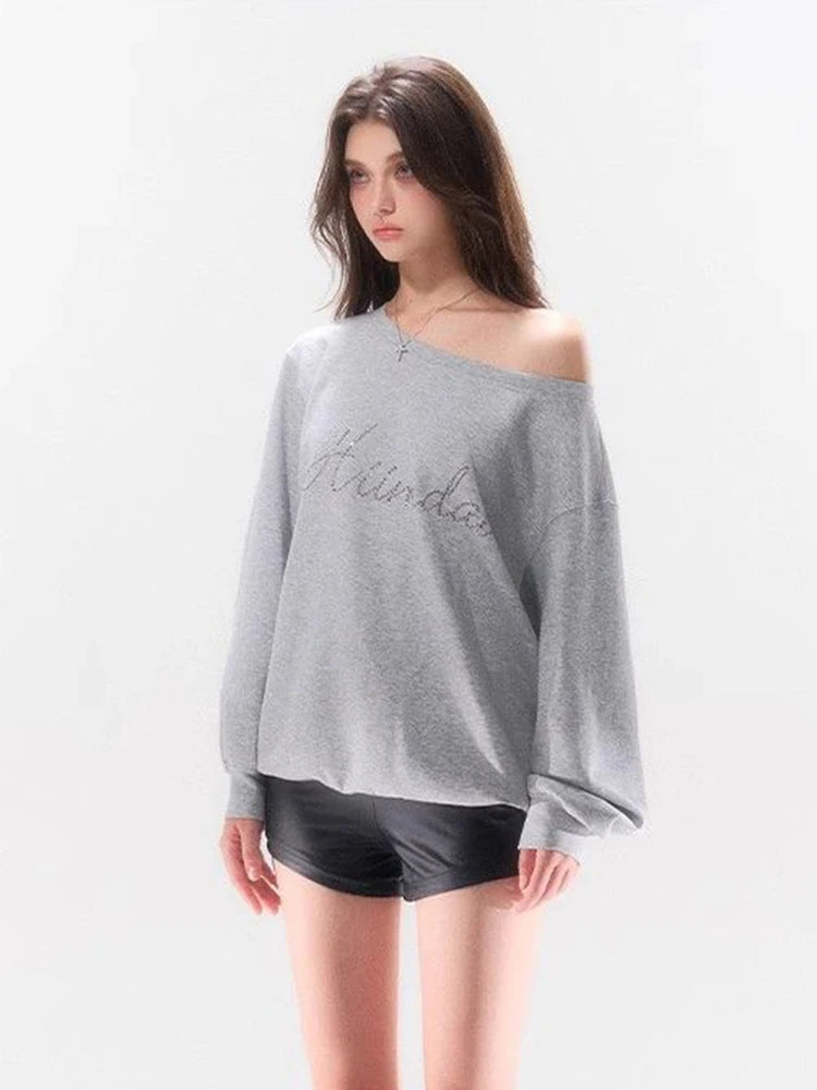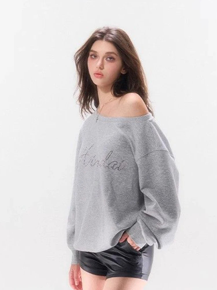 Damen Graues Off-Shoulder-Sweatshirt mit Buchstaben-Diamanten