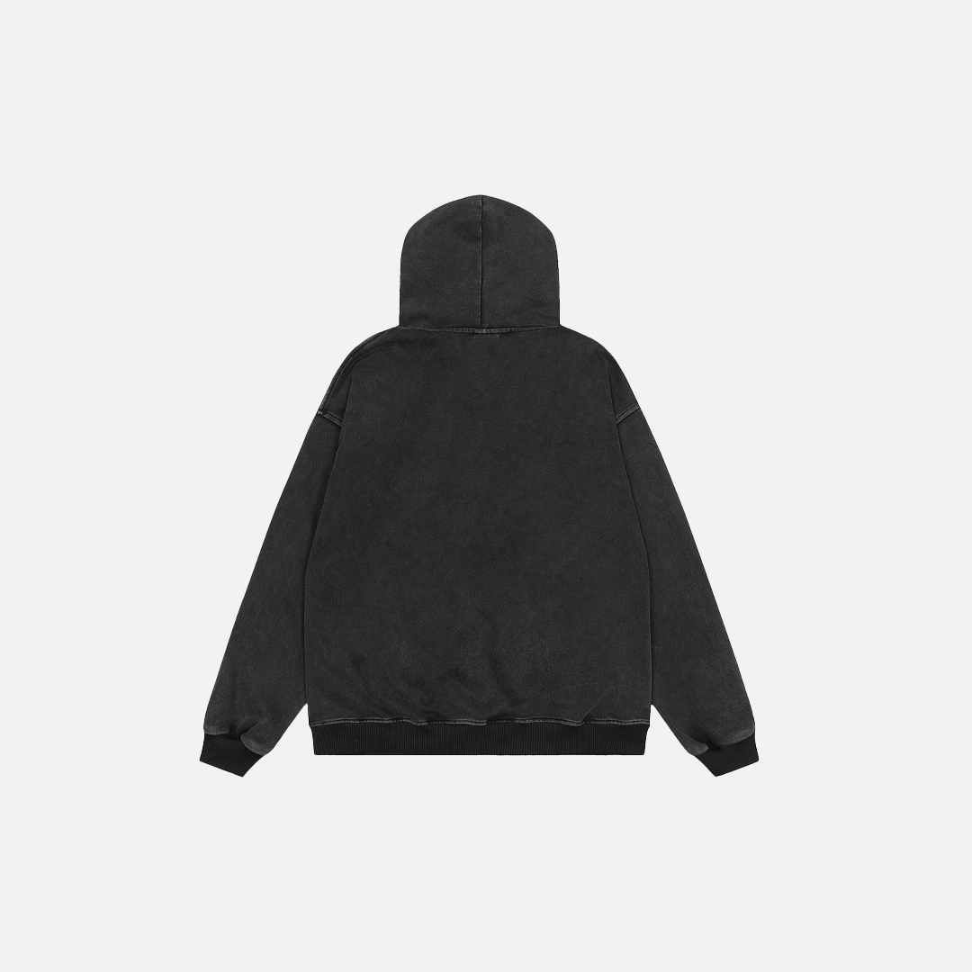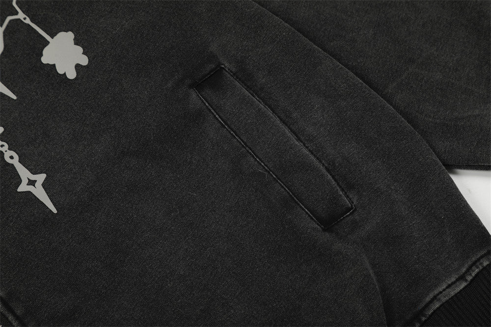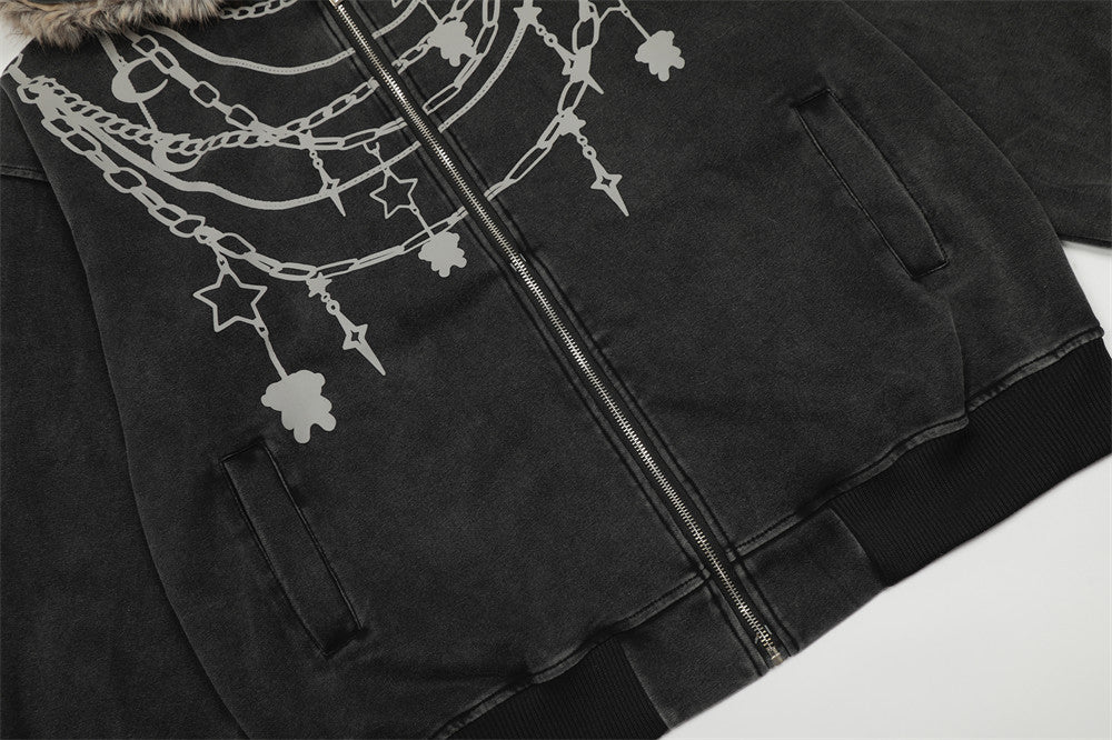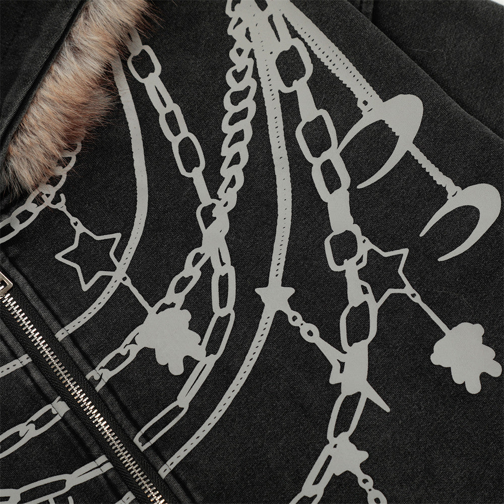 Y2K Chain Print Faux Fur Hooded Washed Sweatshirt