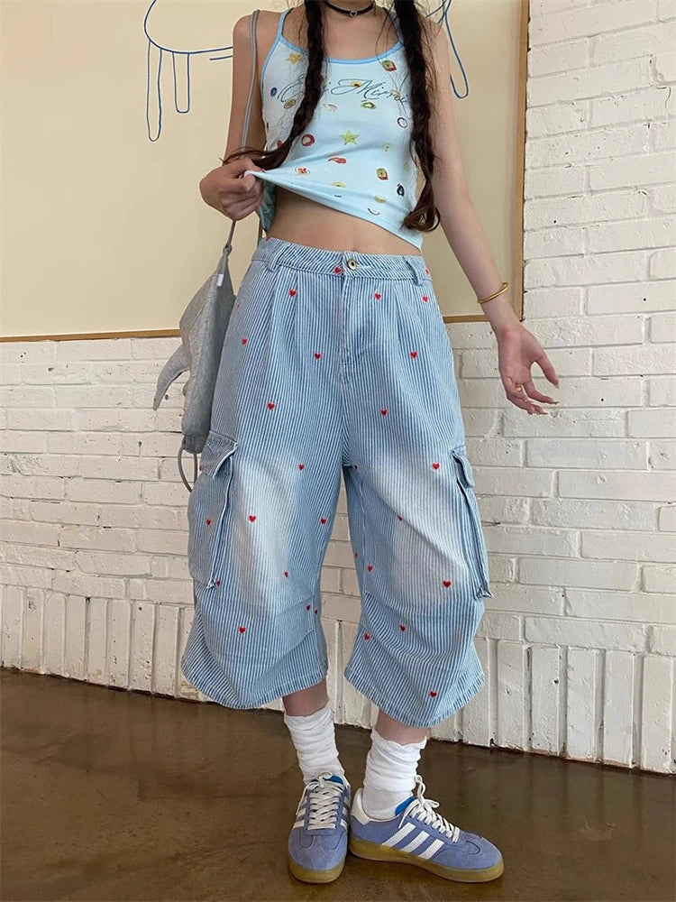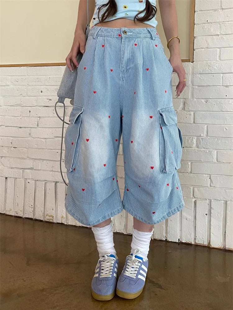 Chic Striped Heart Embroidery Cargo Denim Jorts
