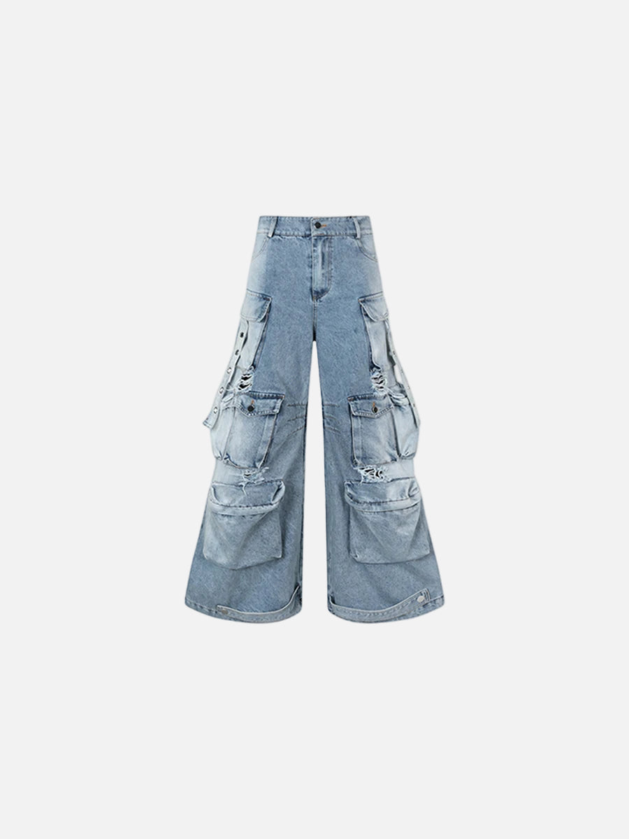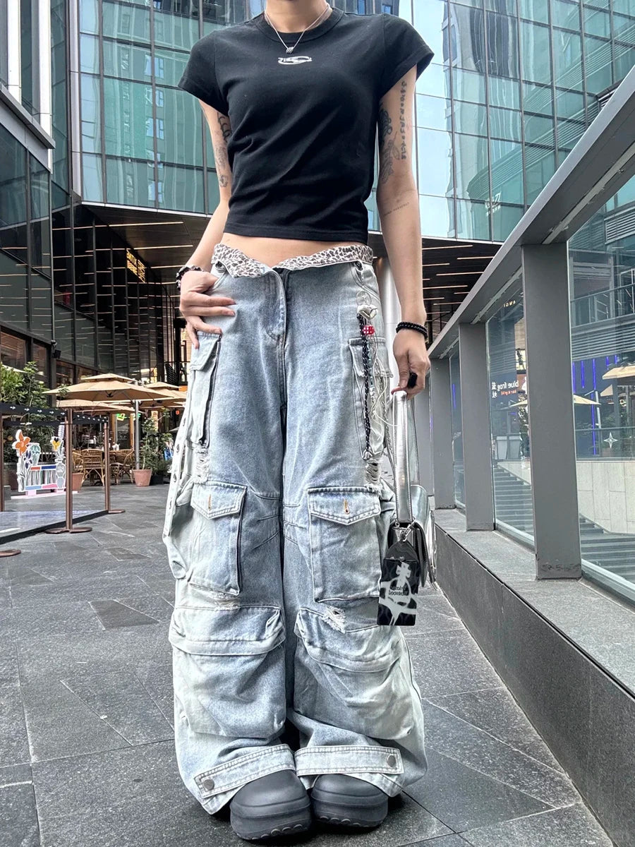 Leopard Print Low Rise Distressed Cargo Denim Jeans