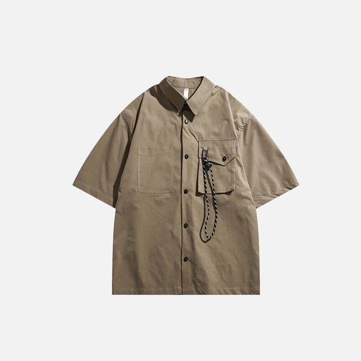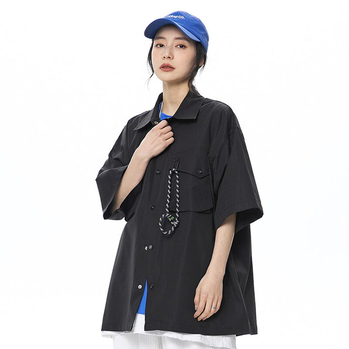 Stellen Sie sich das üppige Gefühl von weichem Polyester, dem klassischen Reverskragen, dem zeitlosen Solid-Muster und dem raffinierten Broadcloth in einem Kleidungsstück vor. Spüren Sie den Komfort dieses übergroßen Hemdes mit Seiltaschen!