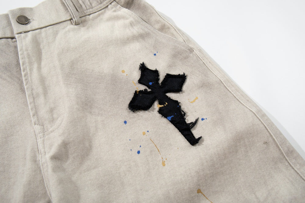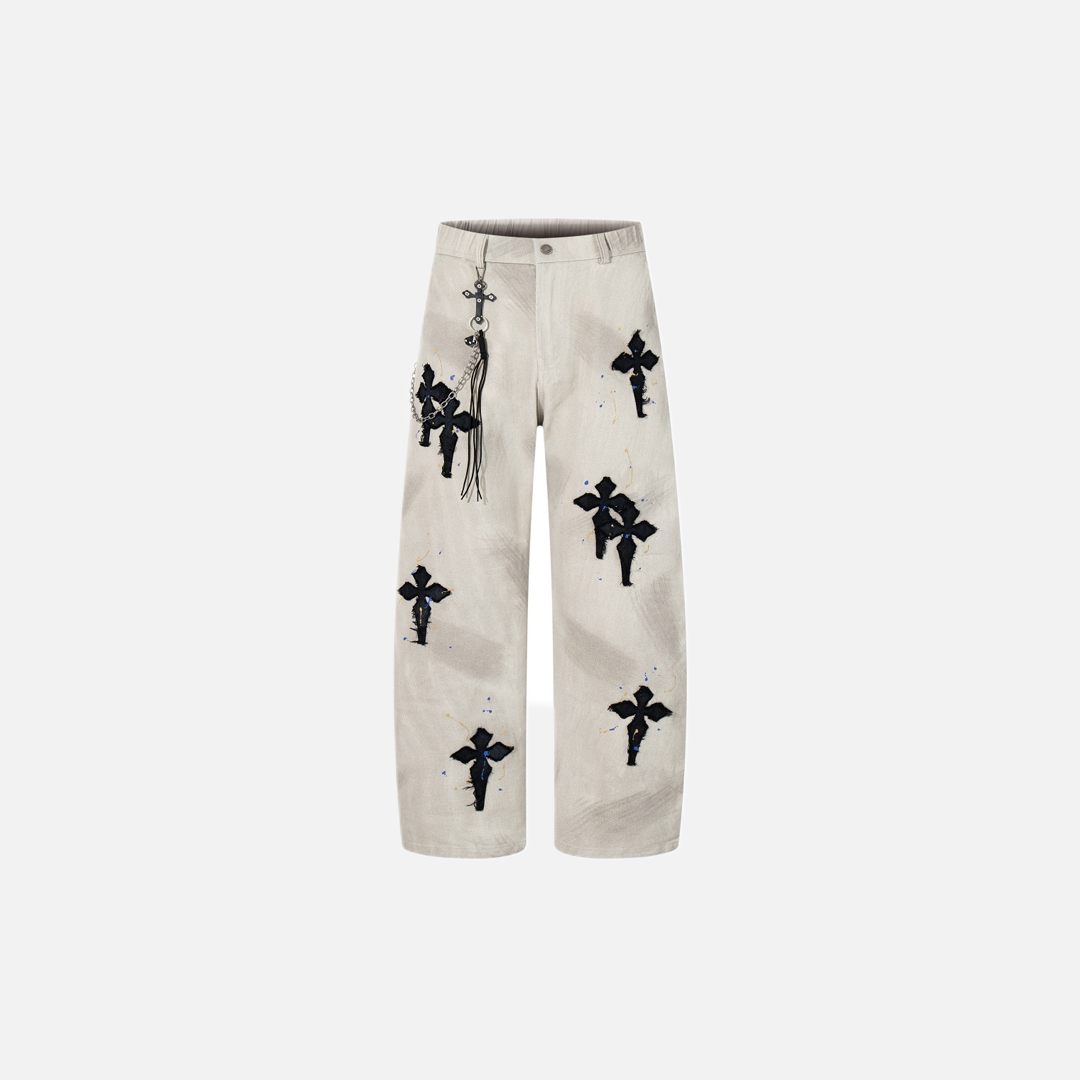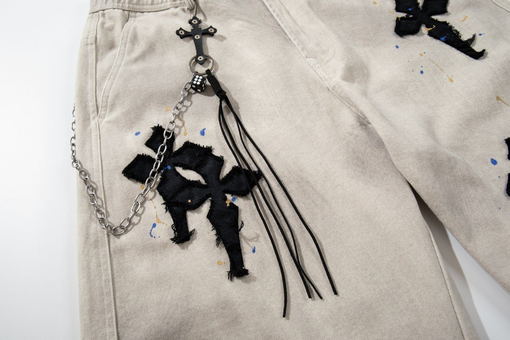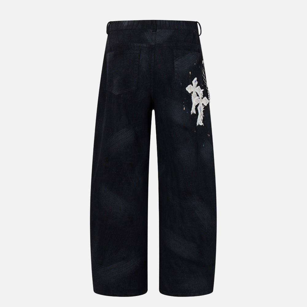 Gothic Cross Embroidered Distressed Denim Jeans