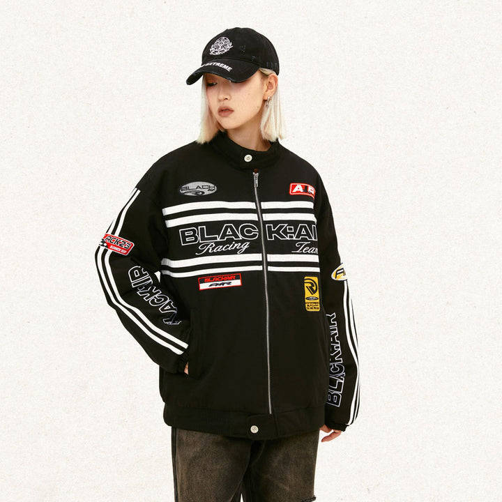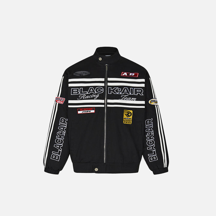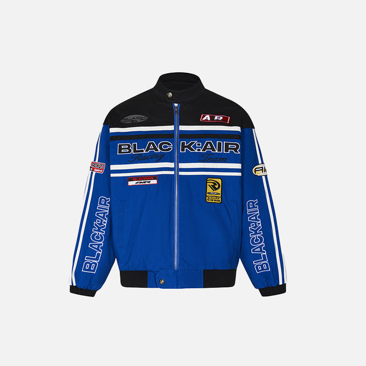 Crafted from durable polyester for a sleek and sporty look, this Motorsports Embroidered Racing Jacket features a classic stand collar for added style and convenience.