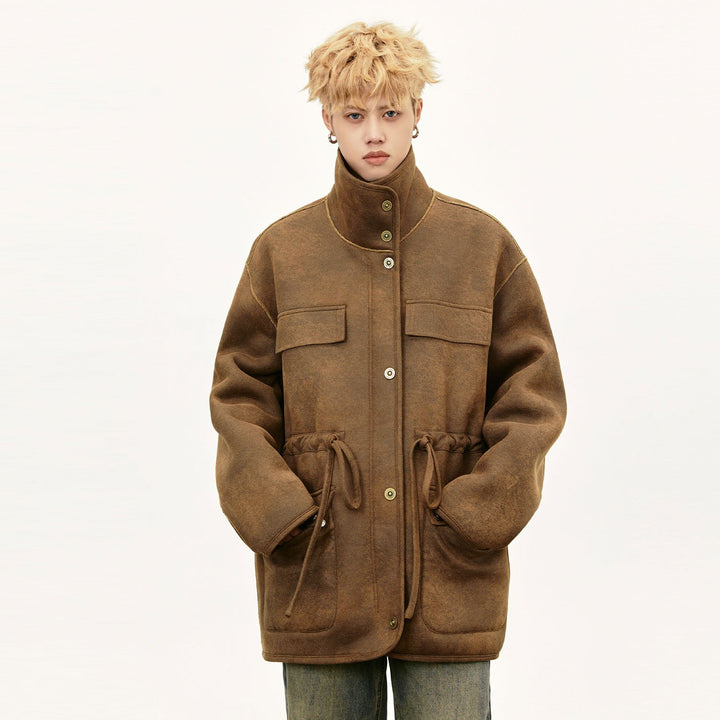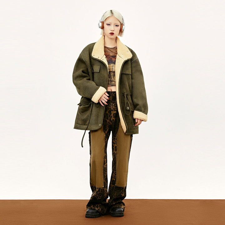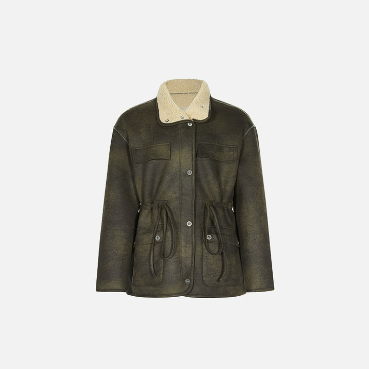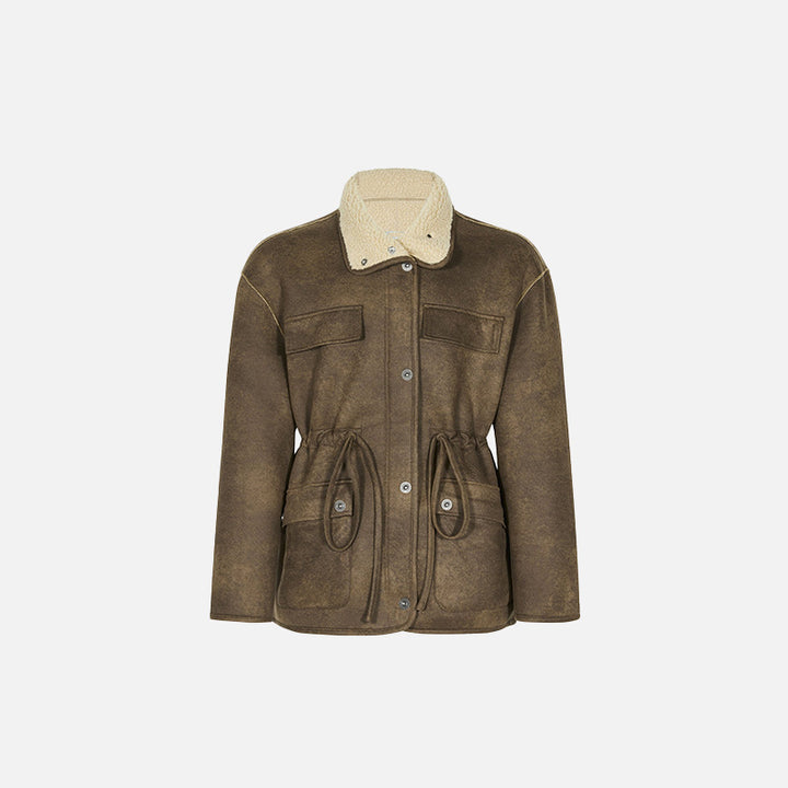 Este abrigo está confeccionado con lujosa lana de cordero y tiene un elegante cuello vuelto confeccionado con un material de poliéster cálido y acogedor.