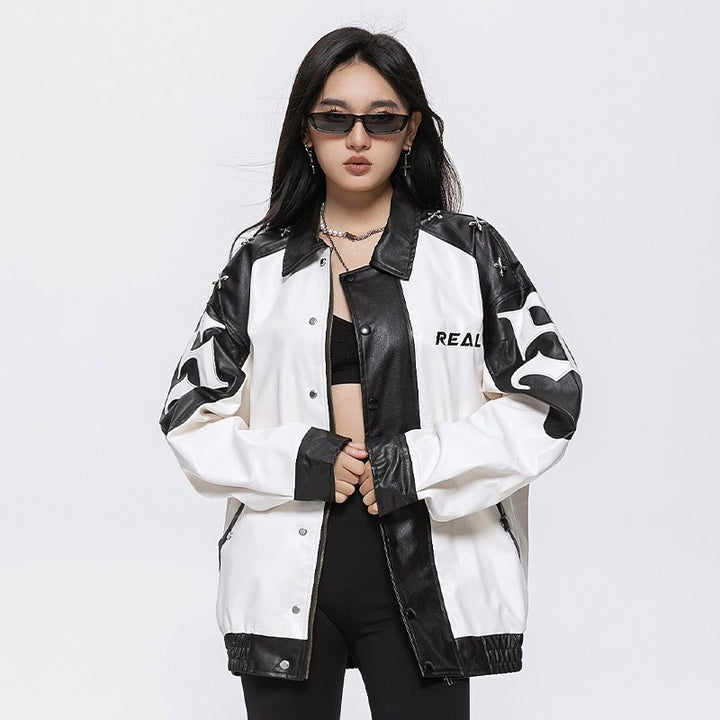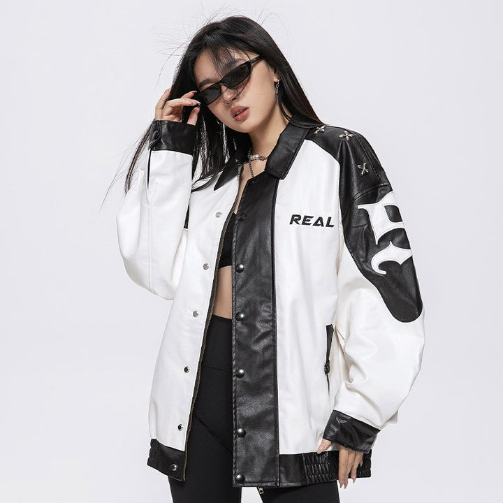 Chaqueta universitaria de cuero con bloques de color extragrande