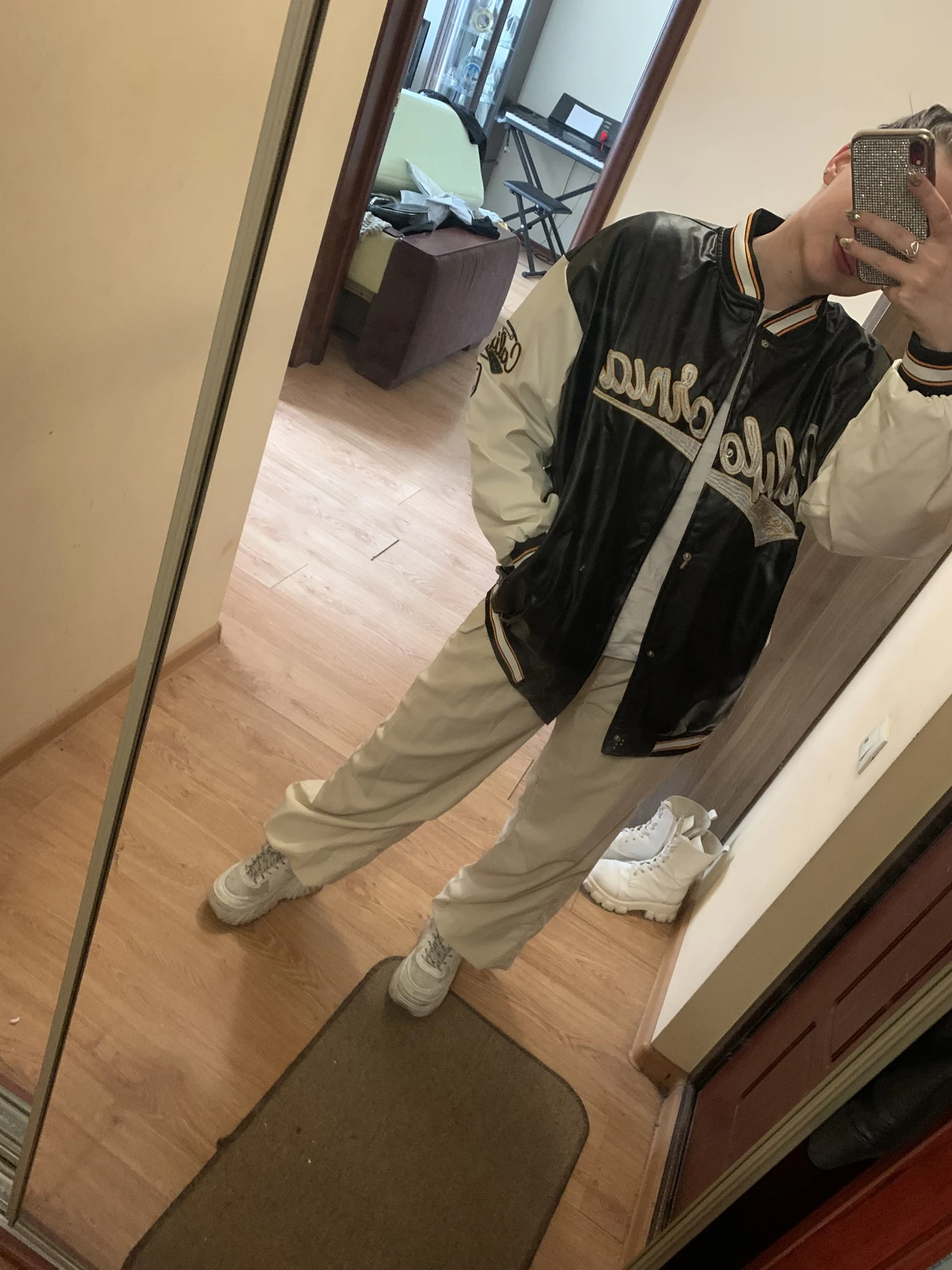 Pretty nice jacket but has more of a windbreaker material. Looks really nice tho and I would recommend. I would recommend ordering one or two sizes bigger for a perfectly baggy fit. (For reference I’m usually a S or XS and I ordered the M). Shipping was also pretty fast.