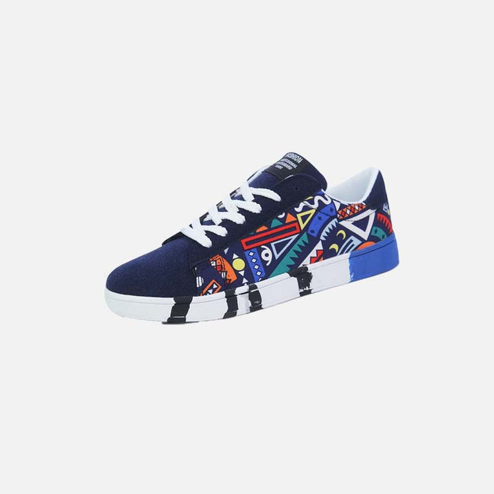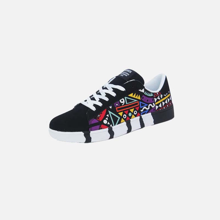 Vibrant style and optimal comfort-- those are the hallmarks of these Colorful Graffiti Skateboard Shoes. Boasting a fun geometric pattern, lace-up closure, and a canvas upper, these shoes will have you feeling ready to rock every step of your journey. Plus, the rubber insole ensures you stay comfy all the while. Go ahead and take your standard size!
