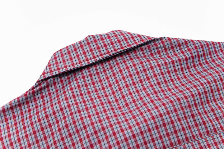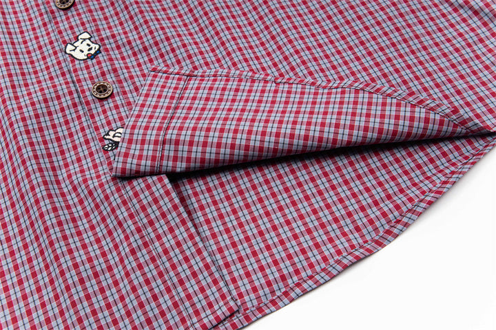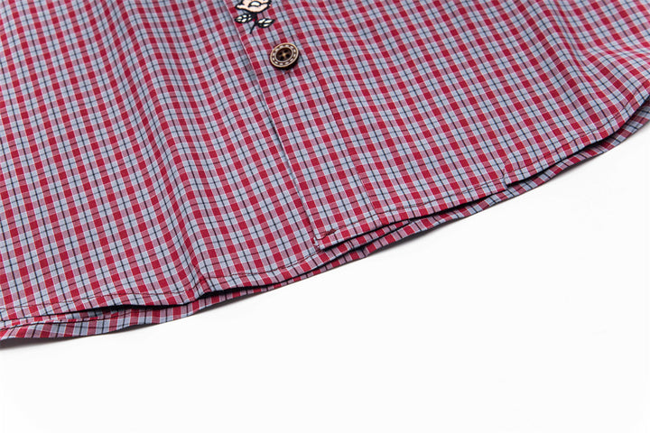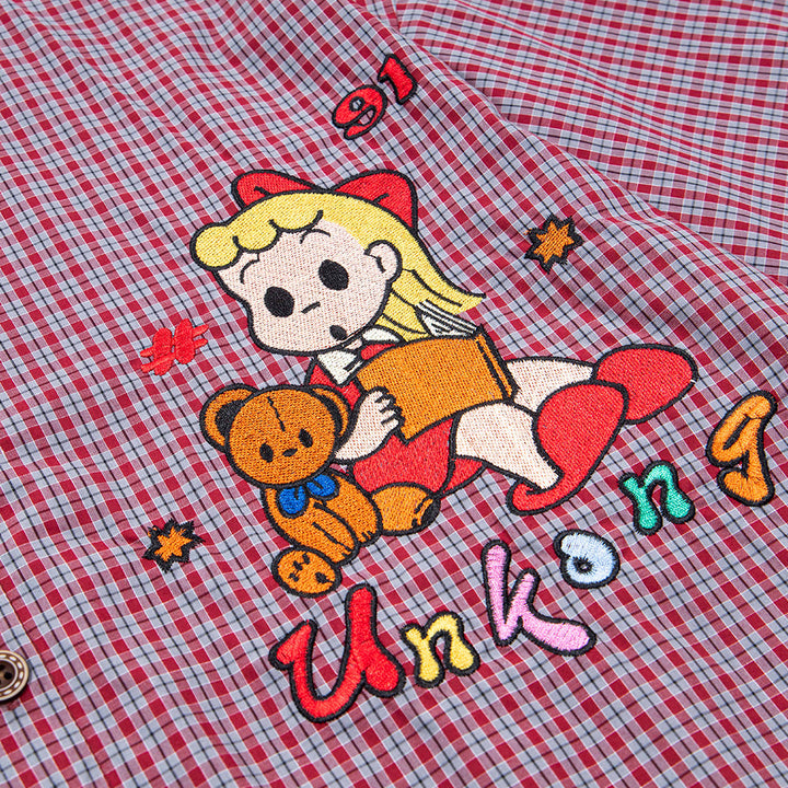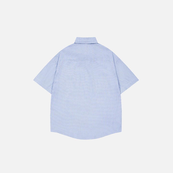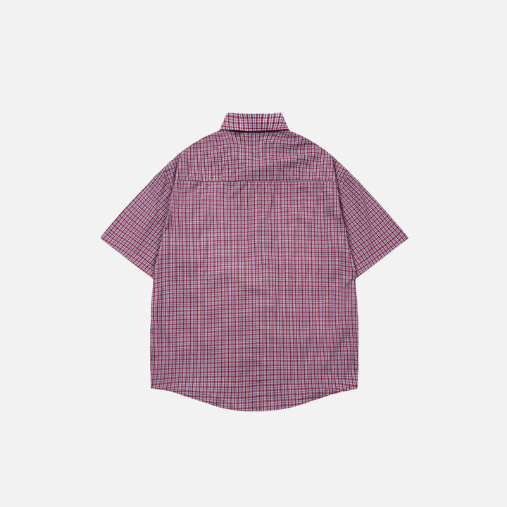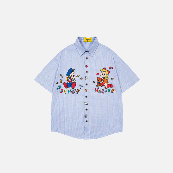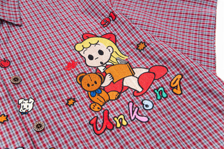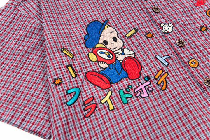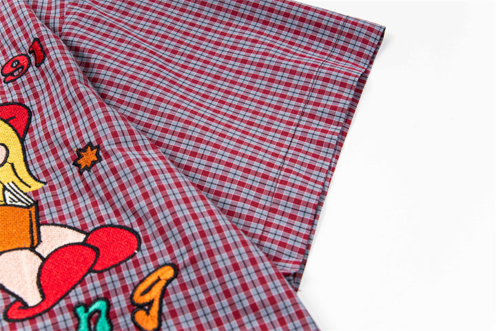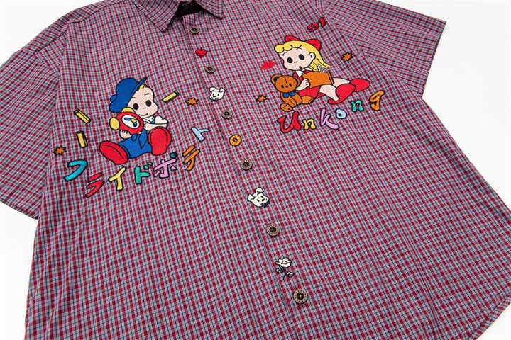 Cool Cartoon Embroidered Plaid Short-Sleeved Shirt