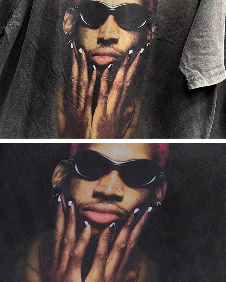 T-shirt buzz. The cut is oversize, but it is better to take 1-2 sizes larger than usual. The material is dense, the pattern is a little pale, but it looks cool.